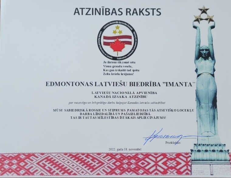 The following certificate was sent to Imanta from LNAK (Latvian National Federation in Canada). It acknowledges IMANTA’s selfless volunteer work for the good of Canadian Latvian society. The last phrase reads “The strength and vitality of our (LV) society is based on the selfless participation of each individual member. That is the truest confirmation of love for one’s nation.” The recognition is greatly appreciated by Imanta!