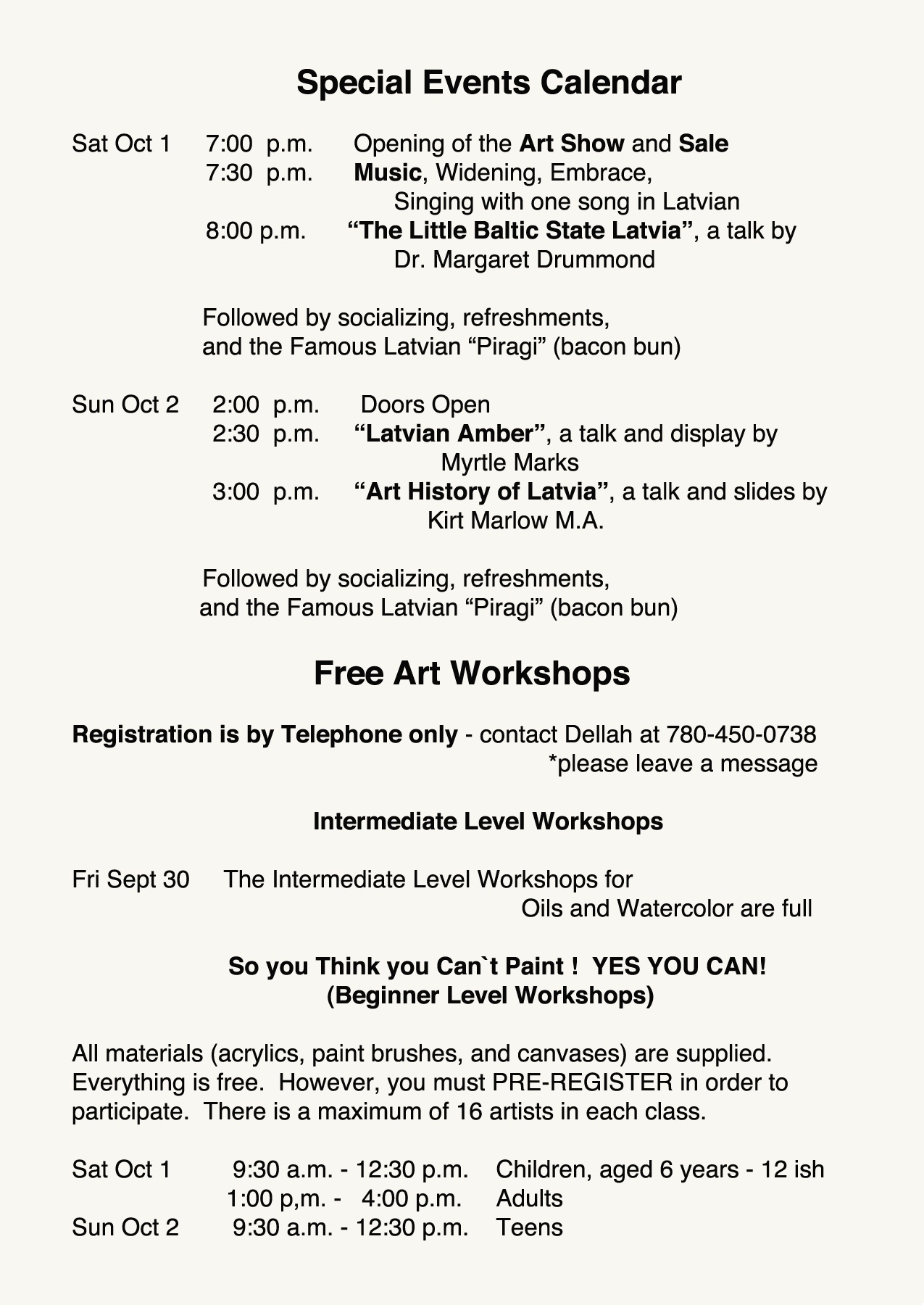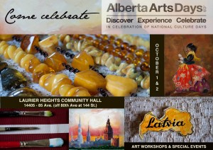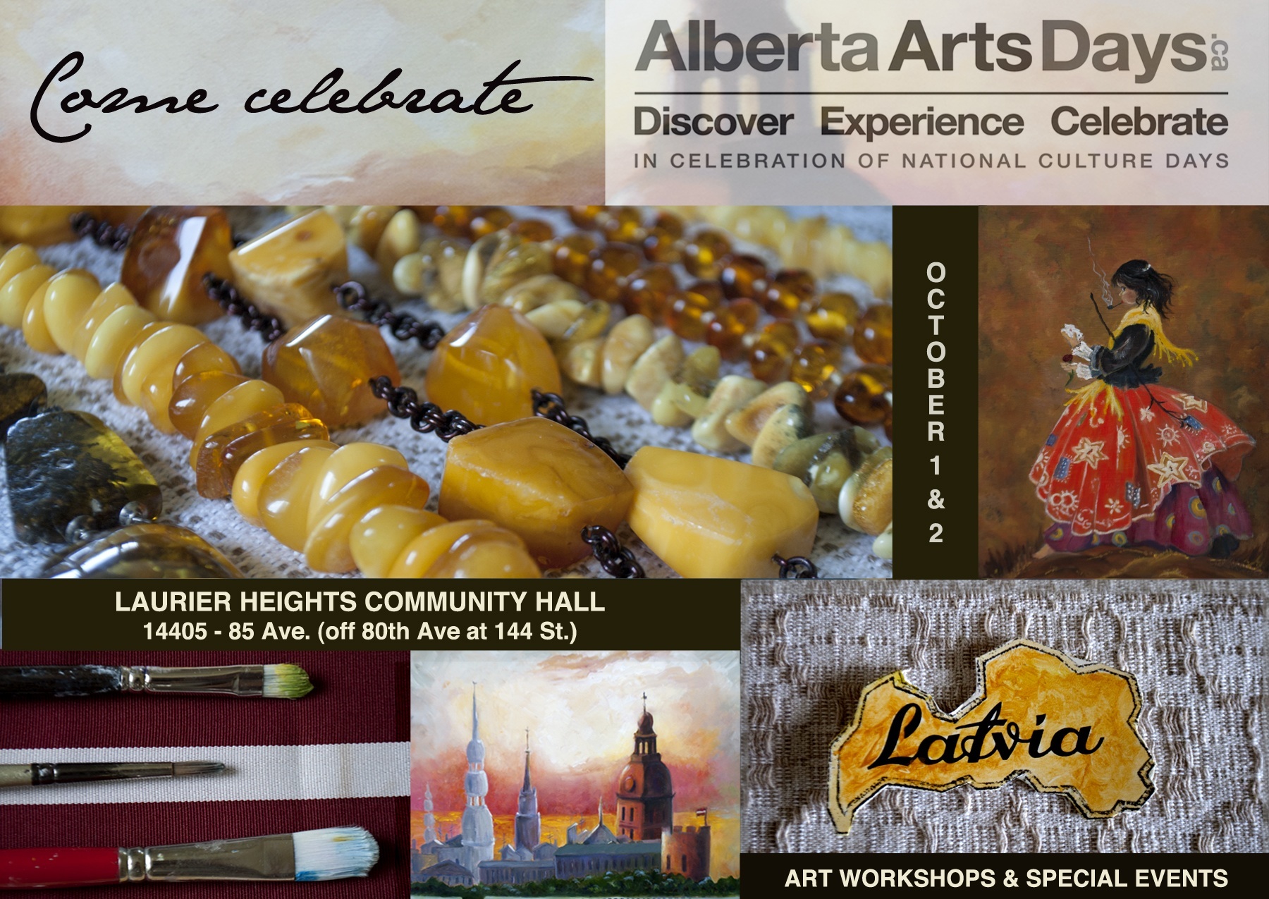 Alberta Art Days, part of Canadian Culture Days, offers opportunities for Albertans to experience and participate in the cultural life of our Province.Edmonton’s Latvian Society IMANTA, the Laurier Heights Art Society, and the Laurier Heights Community League submitted a joint application to celebrate our provincial pride and the importance of art and culture for a vibrantAlberta. We were one of only twelve groups inEdmonton(and sixty-nine throughoutAlberta) to receive a grant to participate!